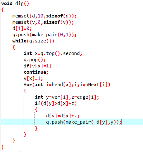 上述代码出自算法竞赛进阶指南,dig模板,o(n^2)的模版在此就不放出了,dig的优点在于稳,速度快,缺点就是不能有负权,有负权时就可以采用速度较快的spfa来解决。因为dig是基于贪心思想的,所以,适用于非负权图。
