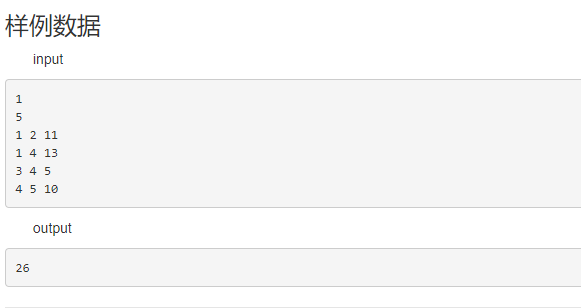 输入的第一行是整数T,表示测试用例的数量。每个测试用例的第一行是正整数n。以下n -1行中的每一行包含由空格分隔的三个整数x,y,z,表示在节点x和节点y之间存在边,并且边的容量为z。节点编号从1到n。 所有元素都是非负整数,不超过200000.您可以假设测试数据都是树度量。