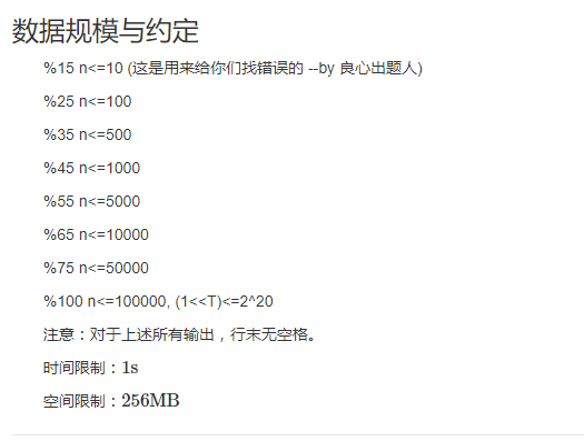第一行输入一个T((1<<T)≤220)T((1<<T)≤220),表示有T组数据