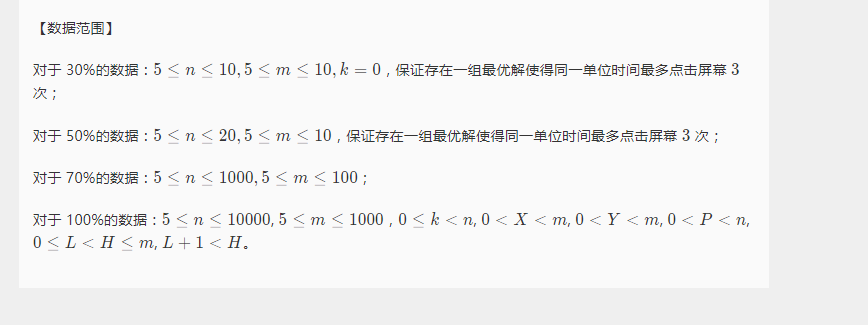 这是一道DP题,题面有一点难懂,NOIP都是这种题,只能练习语文能力了QAQ。由题意可知,一个时刻内可以进行多次跳跃,但是下降只能进行一次,DP方程是可以很轻易的得到的,刚开始我发现有两种情况,先设f[i][j],代表在第i列上达到j高度需要的最少点击数f[i][j]=min(f[i-1][j-k*x[i-1]]+1,f[i][j]);这是由上一列点了k次,上升了k*x[i-1]高度到达了j,还有一种就是f[i][j]=min(f[i][j],f[i-1][j+y[i-1]]);但是这是显然没有想全面的,还有到达m或超过m全部都算在顶飞,并不会死,所以,要特判顶端,并且还有一种很怪异的判断,就是意思上是直上直下的飞,因为这是一个没有速度概念的,你只要手速快,可以视为智商直下平移到上一条线,在洛谷里如果没有这个判断你会痛失50%的数据,WA到你怀疑人生。还有在最后一点如果不行的话,在找过了几个柱子的时候是要从n……1,这样循环比较好判断,发现有一个合法就直接输出就好了,还有在减柱子数的时候还有判断一下这个上面是否有柱子,如果没有的话就不用去减,没有这个判断会多减。