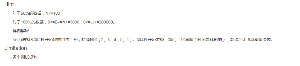 freda开始卖萌后可以随时停止,休息一会儿之后再开始。不过每次freda开始卖萌时,都需要1秒来准备= =,这一秒是不能获得卖萌指数的。当然,freda卖萌和准备的总时间不能超过B。