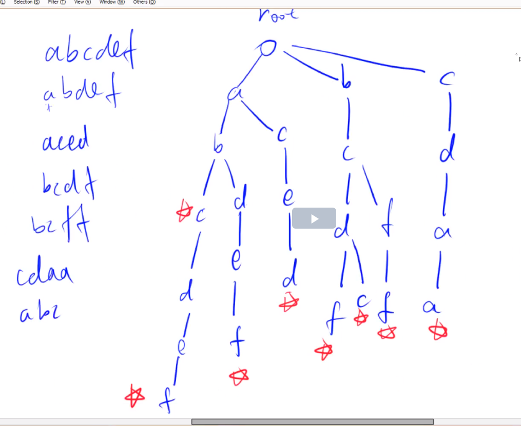 这个题就是Trie树的模板题,查找与插入,一看数据范围就不能进行暴力,只能来用Trie树来进行高效的字符串查找,先建一个根节点(root),然后在插入操作的时候如果有这个字母,就接着往下走,如果没有,就新建一个字母与它相连,依次类推,可以得到上面那幅图,在单词的结尾进行标记。查找时找到结尾如果没有标记输出0,否则输出标记的次数就好。Trie树的基本就是这样,下面上代码