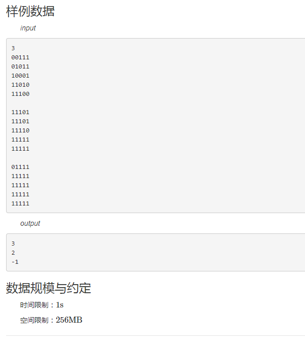 输出数据一共有n行,每行有一个小于等于6的整数,它表示对于输入数据中对应的游戏状态最少需要几步才能使所有灯变亮。 对于某一个游戏初始状态,若6步以内无法使所有灯变亮,请输出“-1”。